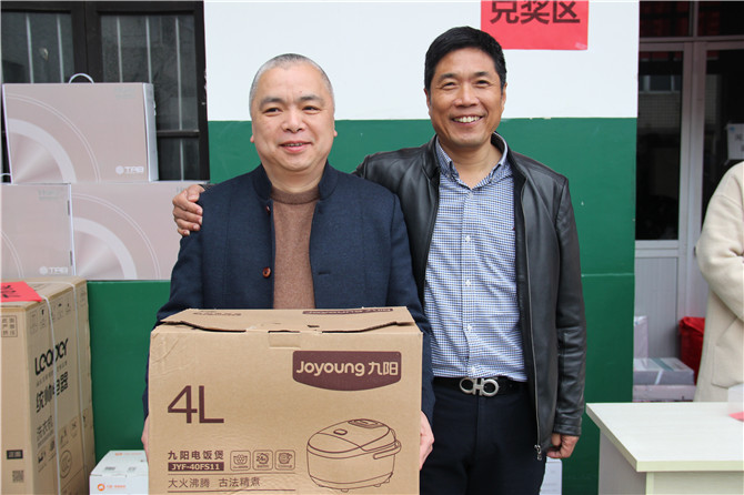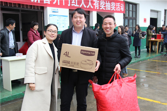 華(hua)寶公司(si)為了迎(ying)接和感謝2017年的(de)(de)辛勤付出及時返崗(gang)的(de)(de)員(yuan)(yuan)工,在(zai)董事(shi)長胡仁寶先生的(de)(de)親自帶領下,公司(si)為員(yuan)(yuan)工準備了豐厚(hou)的(de)(de)獎品(pin):大到(dao)洗衣機(ji)、掃地機(ji)、電飯煲(bao)小(xiao)到(dao)被子(zi)、背包、四(si)件套、開水煲(bao)、電吹風、雨傘(san)、保(bao)溫杯等(deng)等(deng)只要到(dao)場(chang)人人有獎。