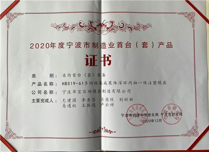 祝賀寧波華寶百順模具制造有限公司自主研發設計生產的HBS19-61多回路集成泵體深環內抽一體注塑模具。取得由寧波市經濟和信息化局、寧波市財政局聯合頒發的“2020年度寧波市制造業首臺(套)產品”獎。