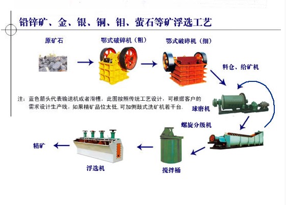 選礦生產(chǎn)線由顎式破碎機、球磨機、分級機、磁選機、浮選機、濃縮機和烘干機等主要設(shè)備,配合給礦機、提升機、傳送機可組成完整的浮選工藝流程。該生產(chǎn)線具有高效、低能、處理量高、經(jīng)濟合理等優(yōu)點。